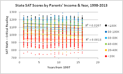 Graphs of actual SAT scores for income brackets and education levels show the distinctiveness of children whose parents have graduate degrees. Trendlines are given with R-squared variances for the highest and lowest categories.