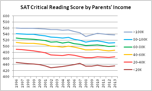 SAT annual reports provide scores of students grouped by their parents’ income and education levels. These graphs of that data should not surprise anyone.